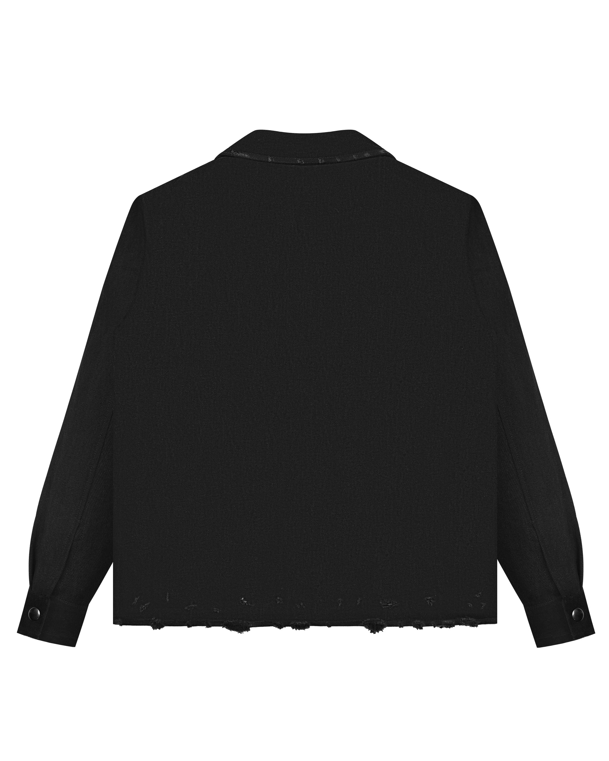 The Distressed Denim Shirt in Black is cut from washed black denim with a distressed hem and detailing. Designed with a boxy fit, the shirt features flap chest pockets and tonal buttons for a clean, minimal finish.