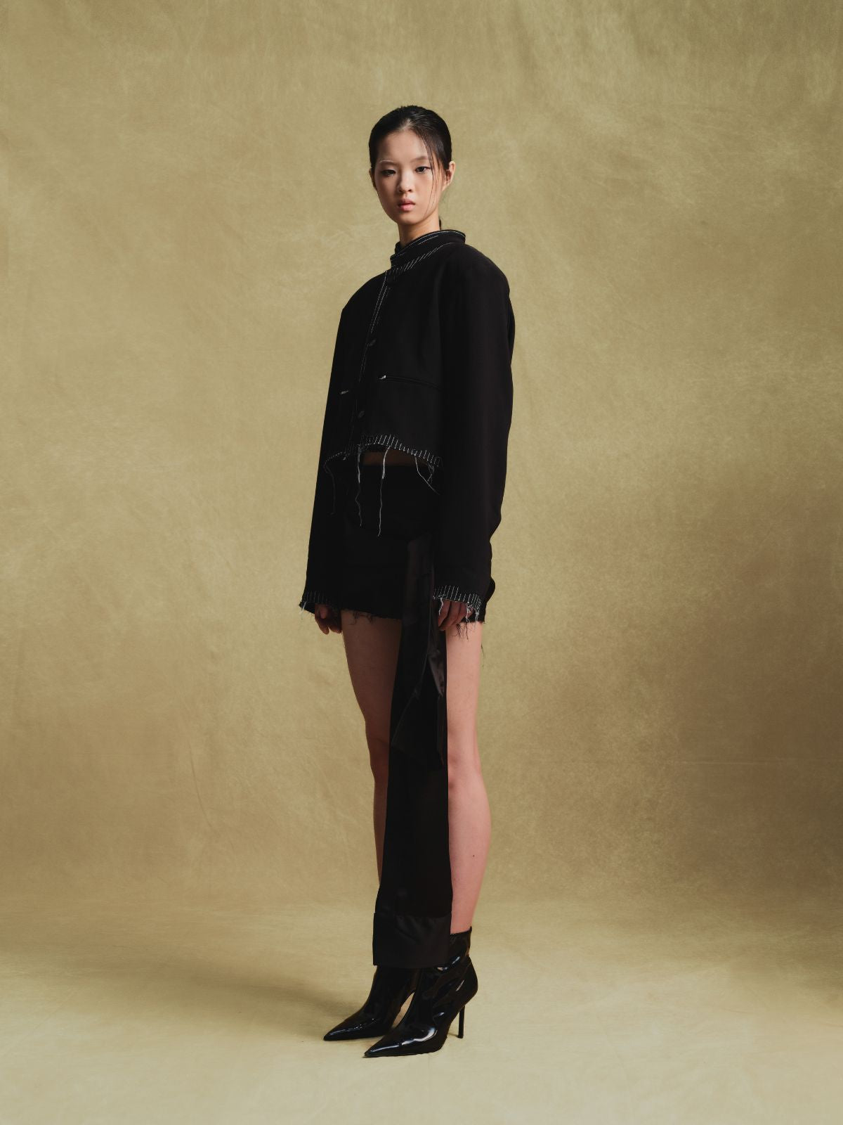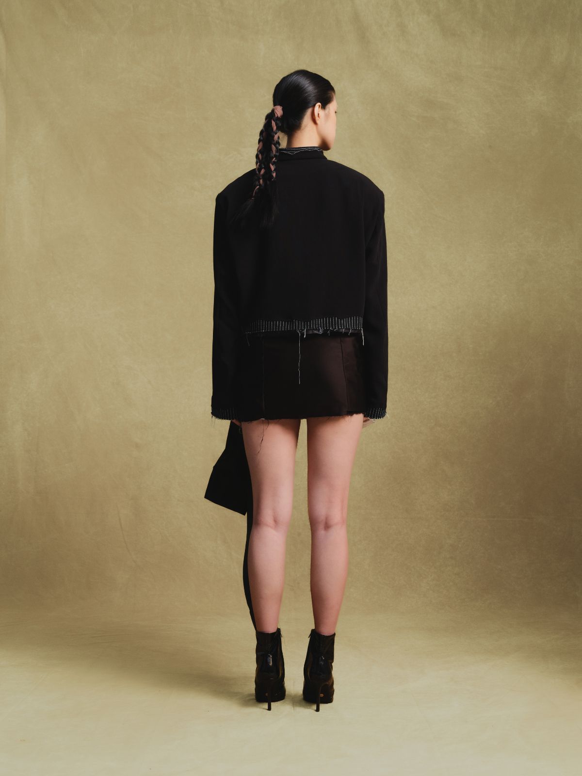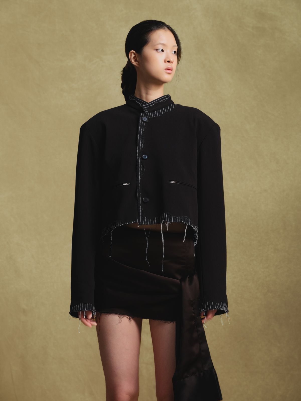 The silhouette balances tradition and tailoring, drawing inspiration from celebratory uniforms while maintaining a sharp, modern look that blends formal refinement with the ease of workwear.